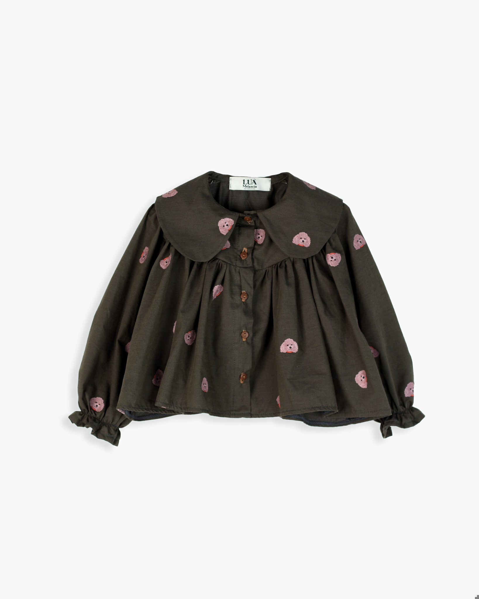Blusa de decote redondo e gola bébe, manga comprida com punho elástico que termina em folho. Pormenor de estampado. Fecho de botões á frente.