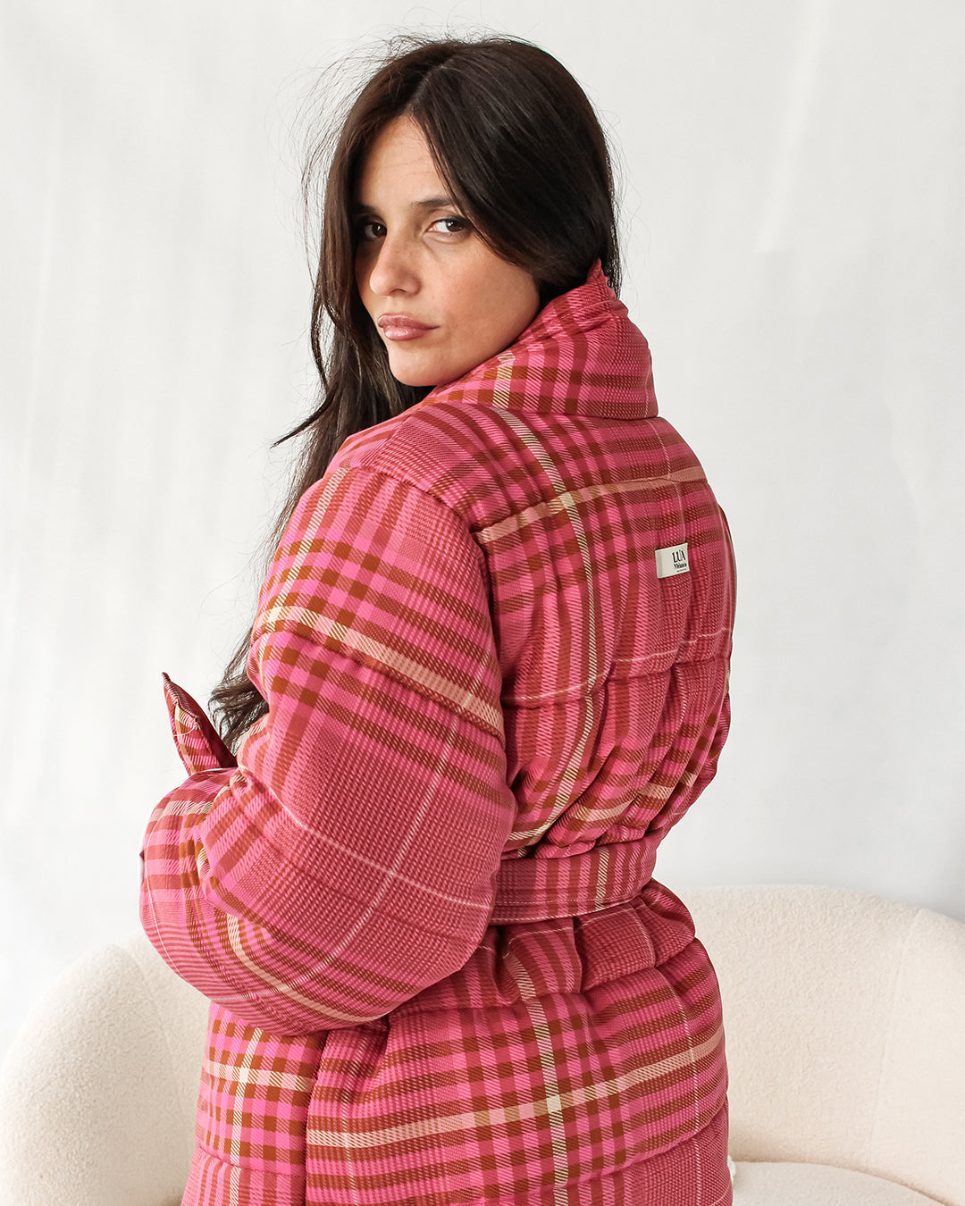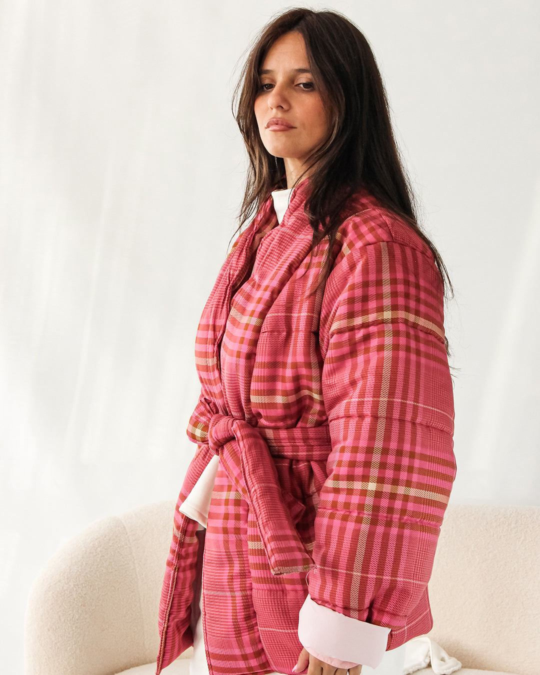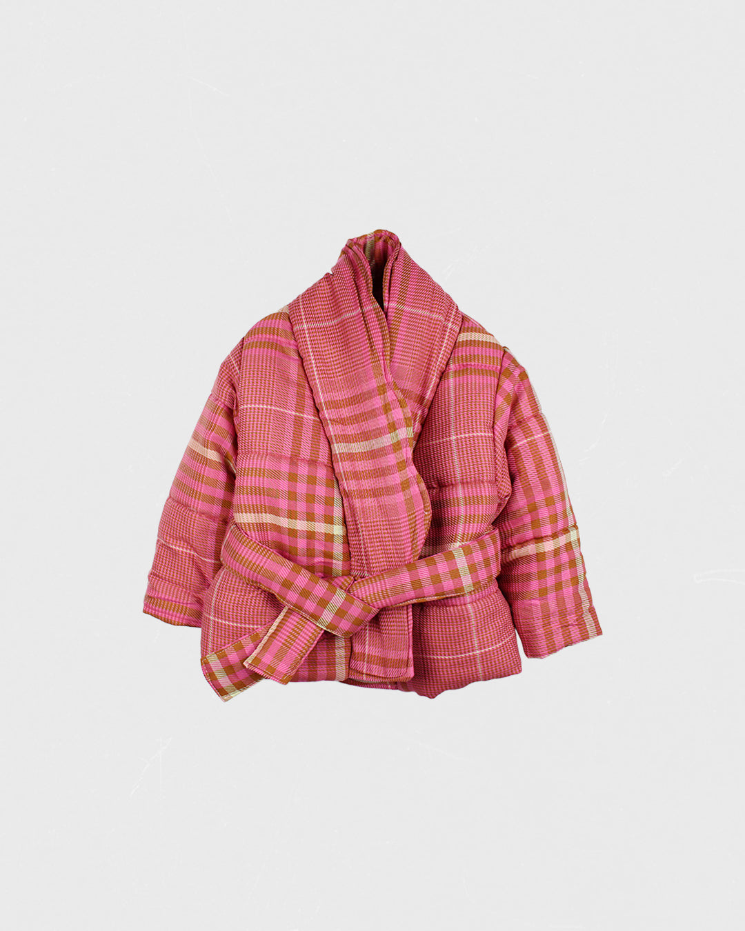 Blusão tipo quimono acolchoado, decote em V com inspiração retro. Manga comprida larga. Fecho com cinto.
