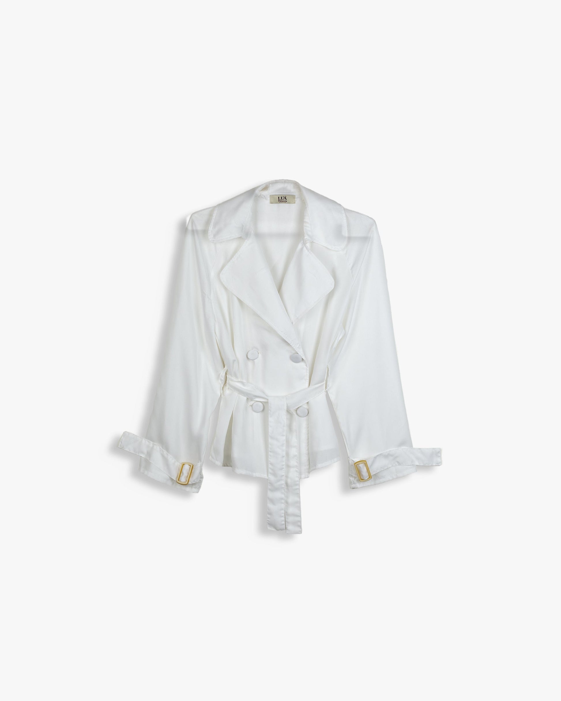 Camisa com gola de lapela, manga larga e comprida com acabamento em presilhas. Cinto no mesmo tecido.