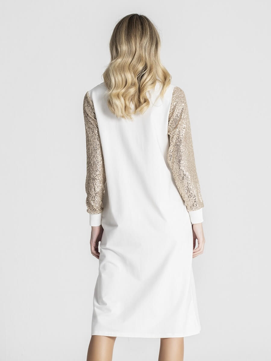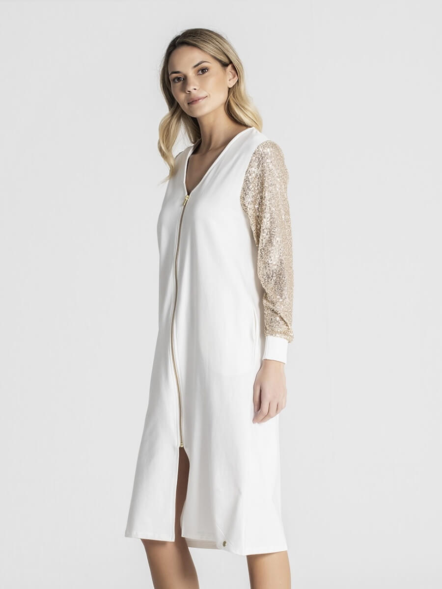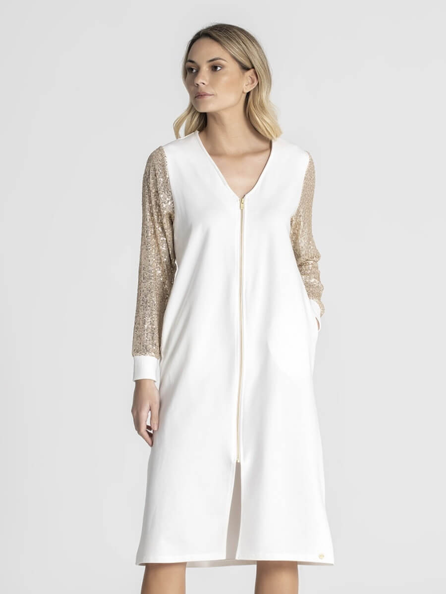 Casaco com mangas em lantejoulas, aperta na frente com fecho. 100% Algodão. Fabricado em Portugal