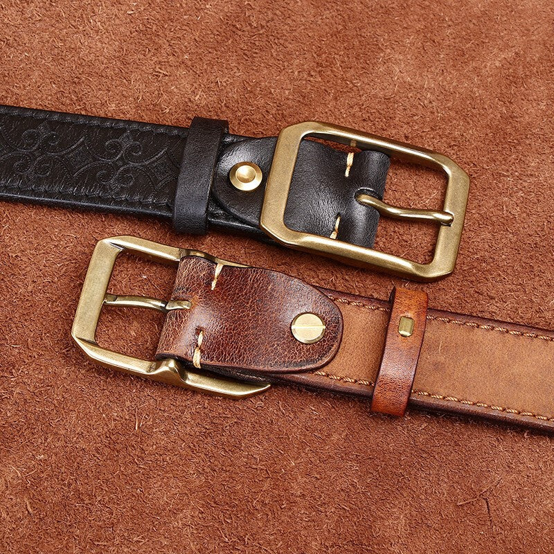 Fabricado com 100% couro de vaca da primeira camada, este cinto apresenta uma textura robusta e acabamento premium, garantindo longa durabilidade e um ajuste confortável ao longo do tempo. A fivela de pino em metal resistente complementa o visual com um toque elegante e funcional.