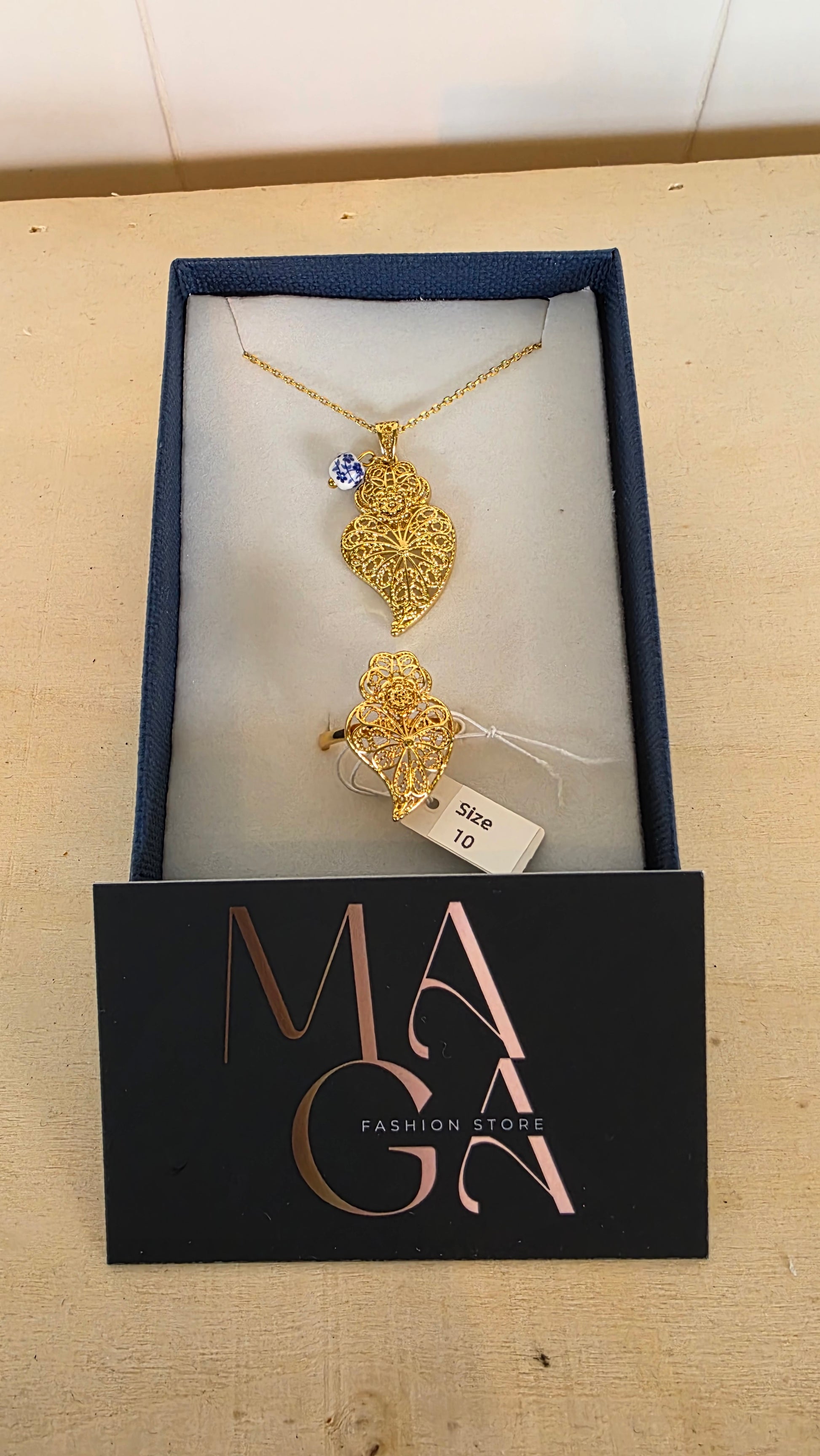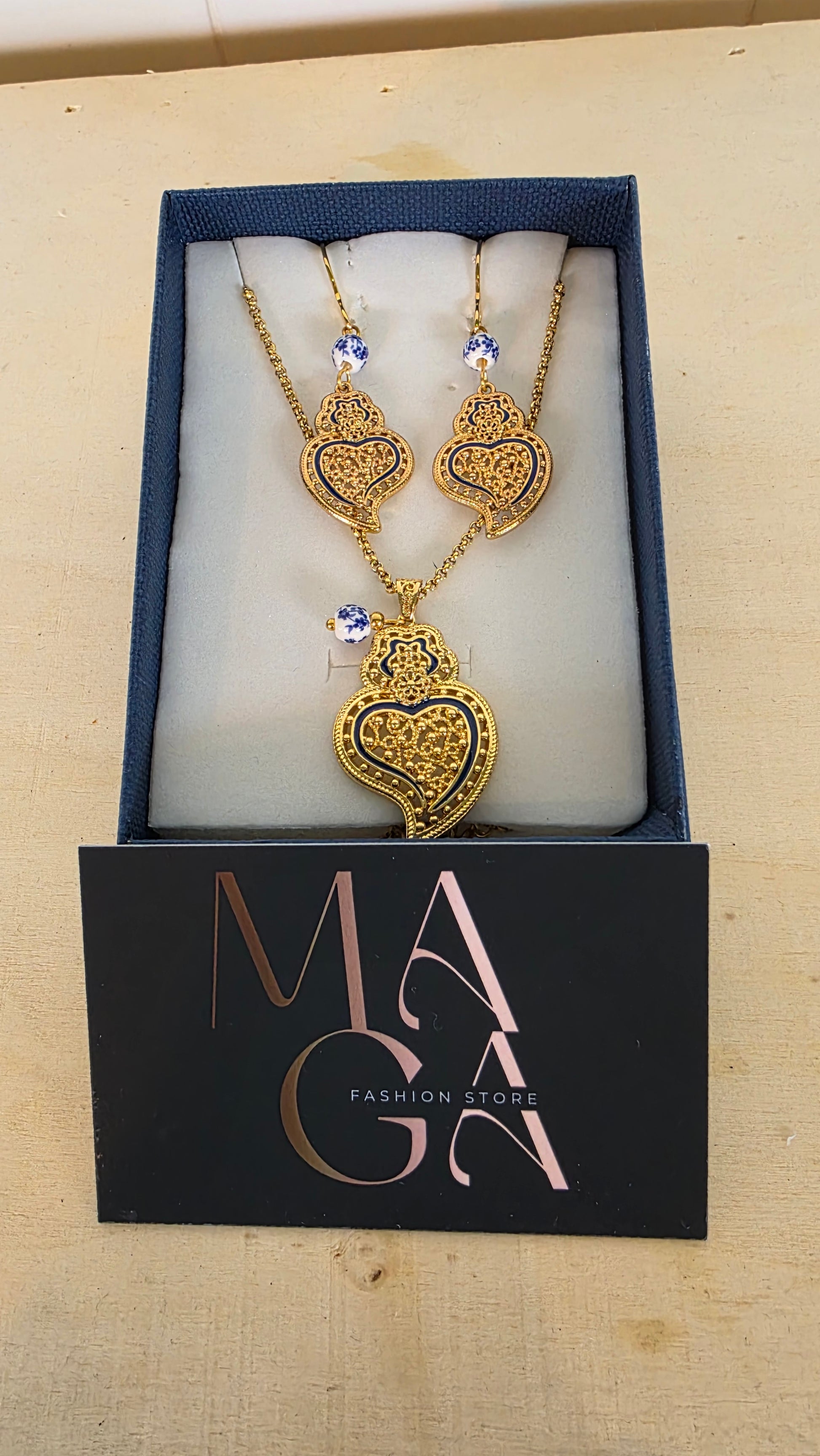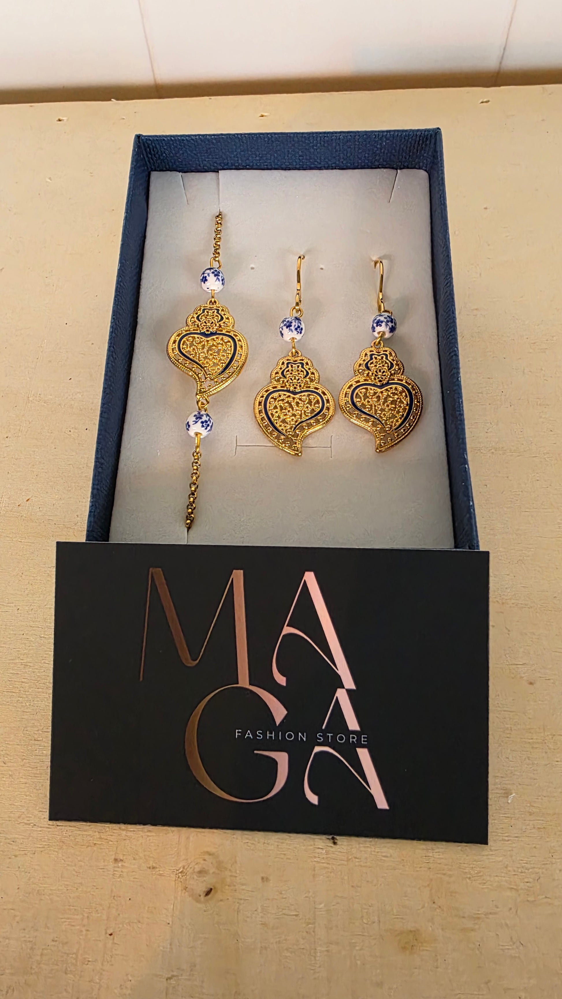 Este conjunto combina elegância e significado, reunindo colar, brincos e/ou pulseira com o emblemático coração trabalhado em detalhe. Cada peça é criada com metais reciclados e um banho de ouro de alta qualidade, refletindo o compromisso da MA-GA com a sustentabilidade e o design consciente.